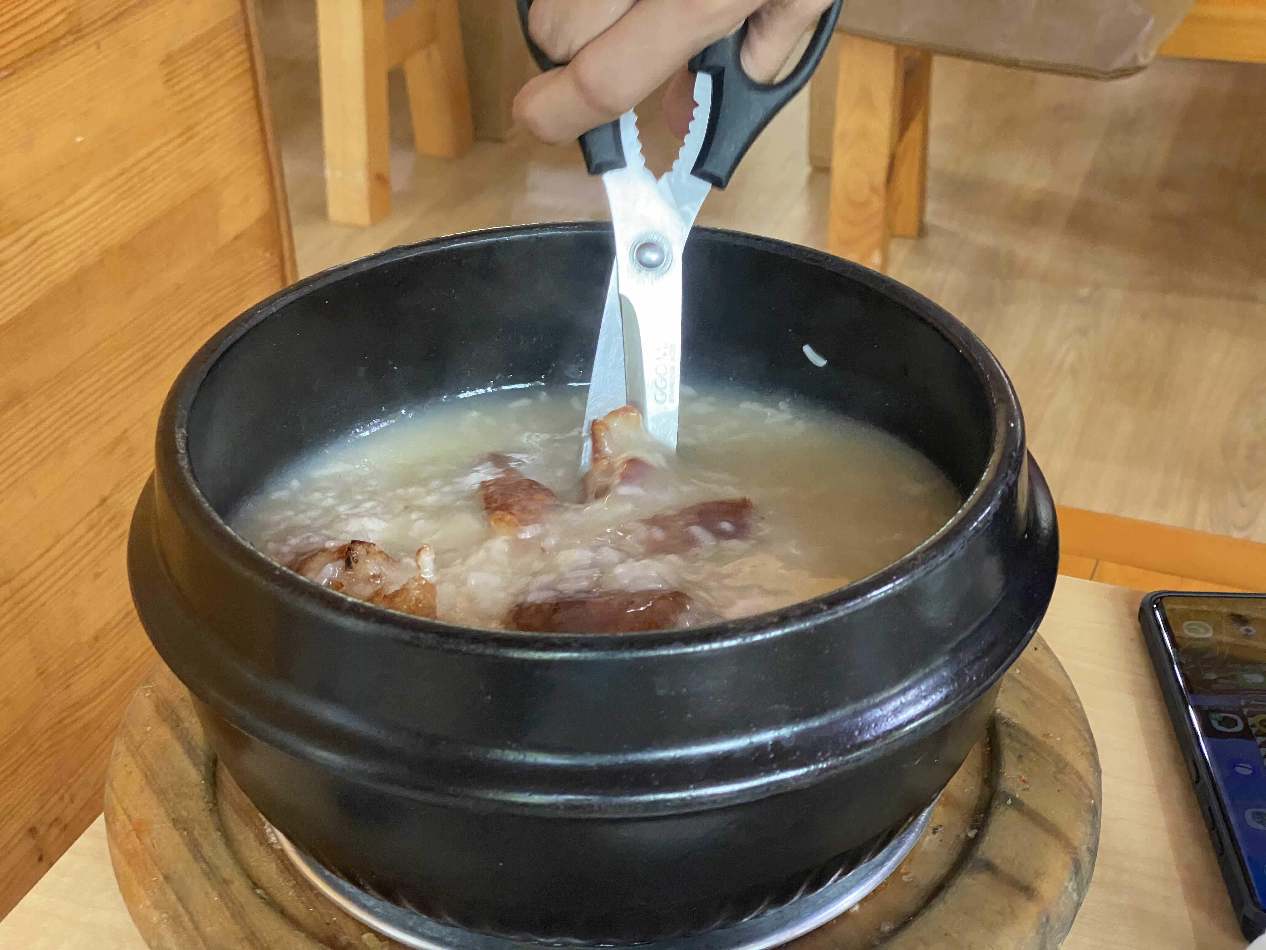 먹기좋게 가위로 잘라 죽 속으로 풍덩 넣어준다